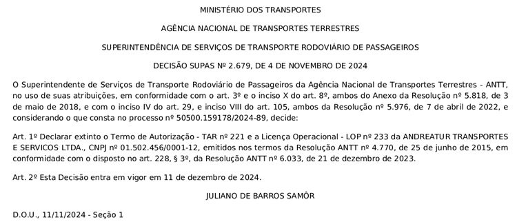 No entanto, antes do julgamento, a ANTT publicou a Decisão SUPAS nº 2.679/2024, em 11 de novembro de 2024, determinando a extinção do Termo de Autorização (TAR nº 221) e da Licença Operacional (LOP nº 233) da Arca Turismo, com base no artigo 228 da Resolução 6.033/2023, que substituiu a antiga Resolução 4.770/2015.