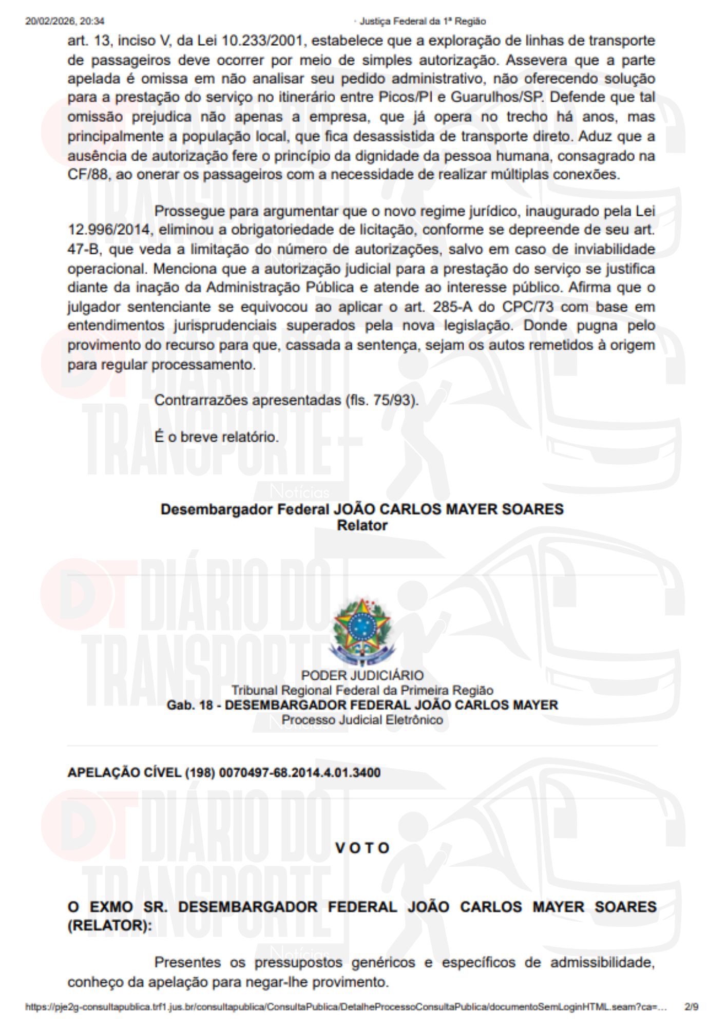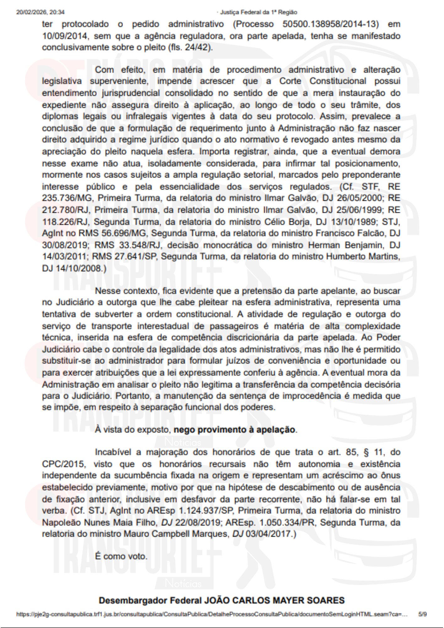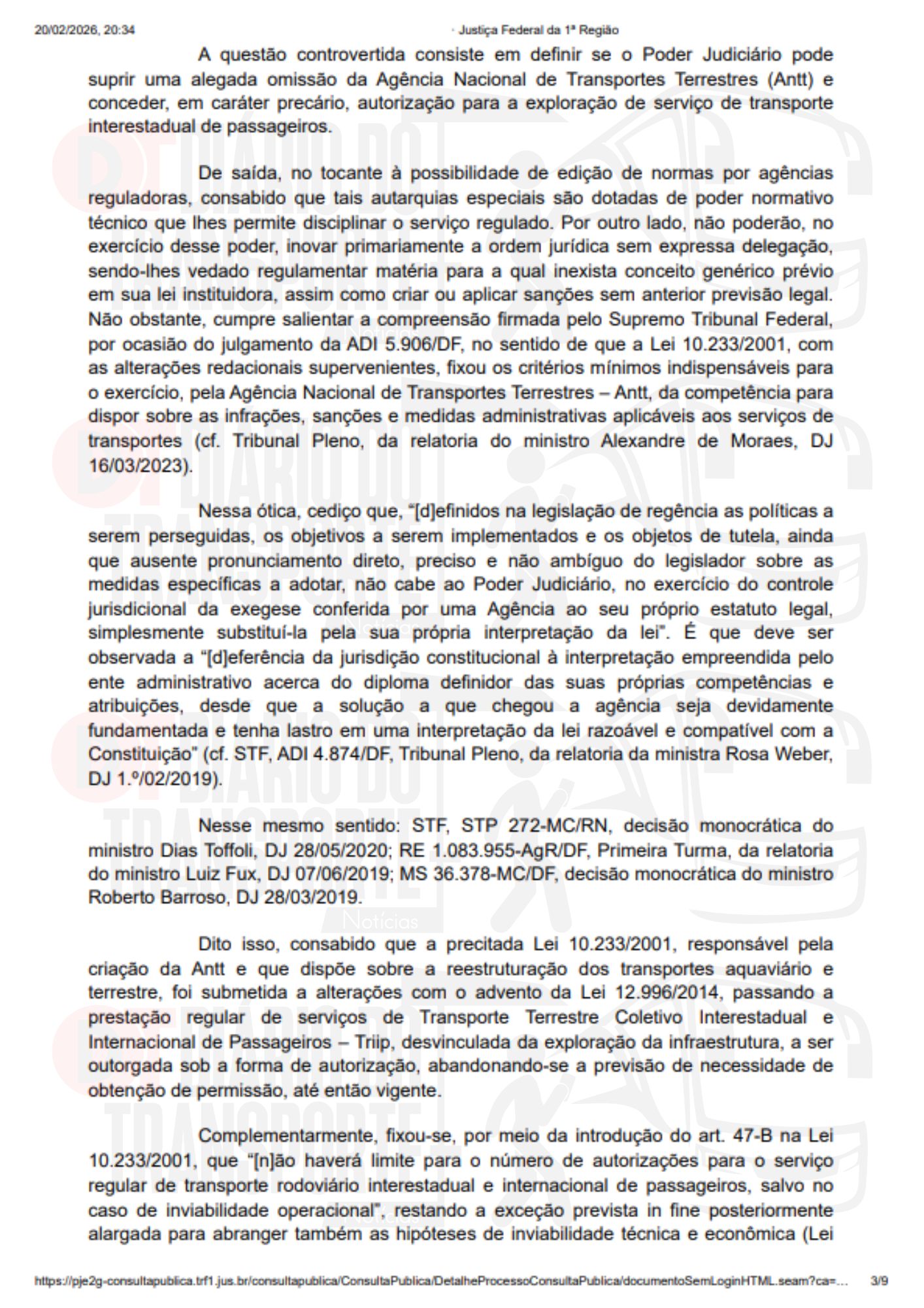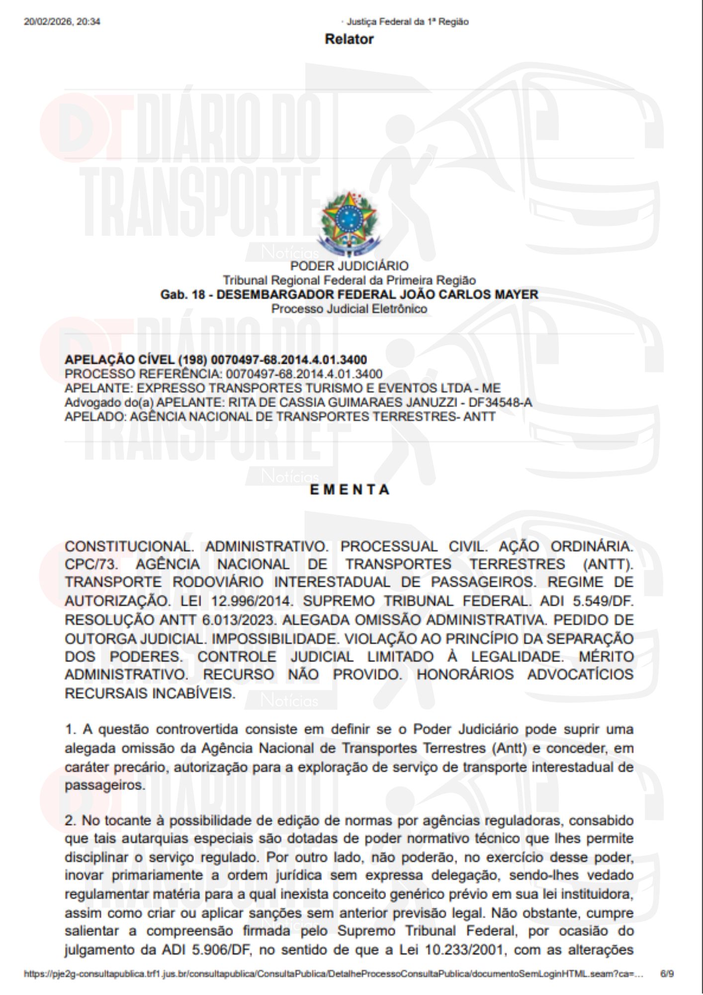 “A atividade de regulação e outorga do transporte interestadual de passageiros envolve elevada complexidade técnica e se insere na esfera de competência discricionária da agência reguladora, e que cabe ao Judiciário apenas o controle da legalidade dos atos administrativos, sendo vedada a substituição da Administração Pública em juízos de conveniência e oportunidade”, segundo o TRF1