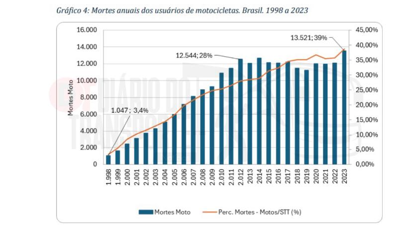Segundo o Ipea, a participação das motos nas mortes no trânsito cresceu de 3%, no fim dos anos 1990, para quase 40% em 2023. Além disso, o modal responde hoje por cerca de 60% das internações decorrentes de acidentes terrestres, gerando gastos superiores a R$270 milhões apenas no sistema público de saúde em 2024.