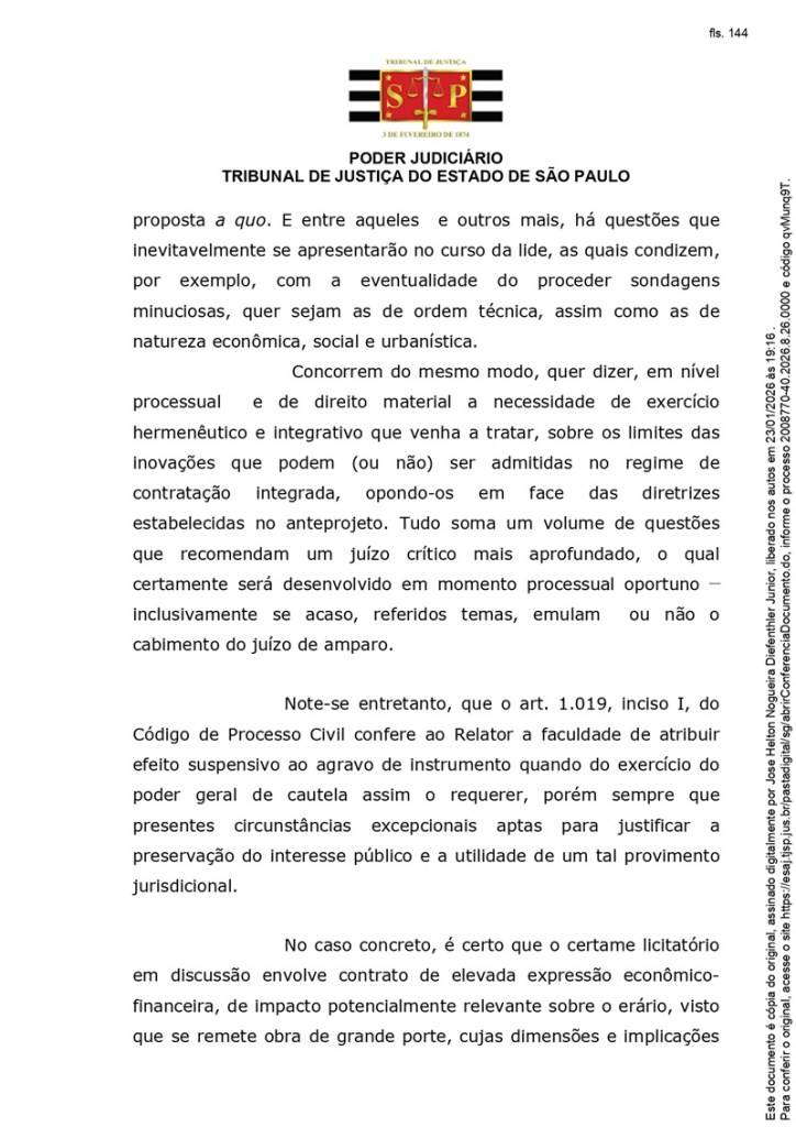 A decisão acrescenta que, neste estágio processual, ainda será necessário aprofundar a análise sobre os limites das soluções técnicas no regime de contratação integrada, bem como sobre os impactos econômicos, urbanísticos e sociais do empreendimento.