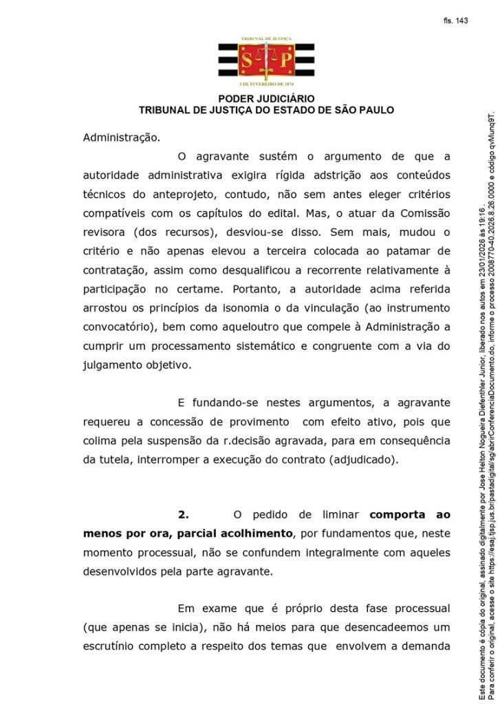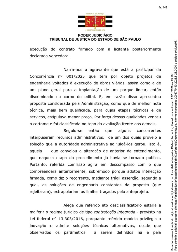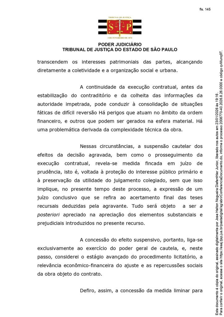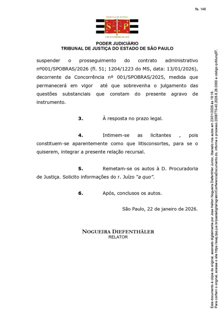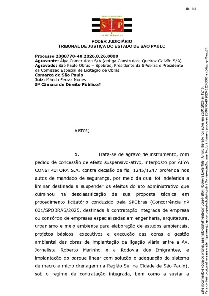 A decisão foi proferida no âmbito de um agravo de instrumento apresentado pela Álya Construtora (antiga Queiroz Galvão) e determinou o sobrestamento da execução do contrato nº 001/SPOBRAS/2026, assinado em 13 de janeiro deste ano, até o julgamento do mérito da disputa judicial.