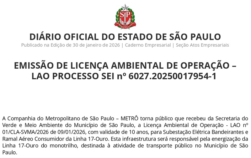 A Companhia do Metropolitano de São Paulo (Metrô) recebeu a Licença Ambiental de Operação (LAO) para a Subestação Elétrica Bandeirantes e para o Ramal Aéreo Consumidor da Linha 17-Ouro do monotrilho. A autorização é fundamental para a energização do sistema, condição necessária para a realização dos testes finais e para a futura operação comercial da linha.