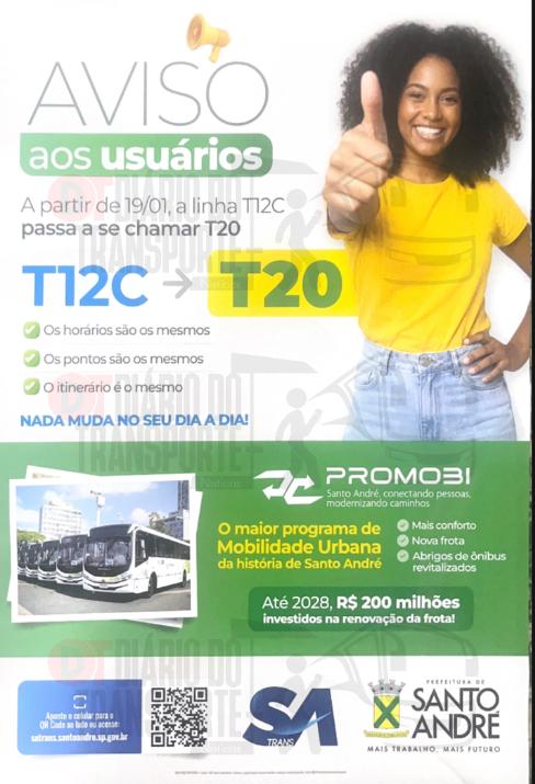 A partir desta segunda-feira, 19 de janeiro de 2026, a linha T-12C, que faz a ligação entre o Jardim Rina e o Terminal Leste, no sistema municipal de Santo André, no ABC Paulista, muda a identificação no letreiro e passa a ser denominada T-20.
