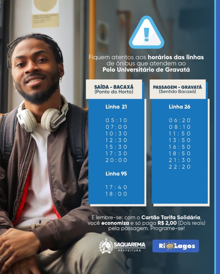 Nesta quarta-feira, 04 de março de 2026, a Prefeitura de Saquarema (RJ) informou que as linhas de ônibus que atendem a região do Polo Universitário de Gravatá terão mudanças na grade horária, com o objetivo de facilitar o planejamento da rotina acadêmica dos estudantes e garantir mais comodidade no deslocamento diário.