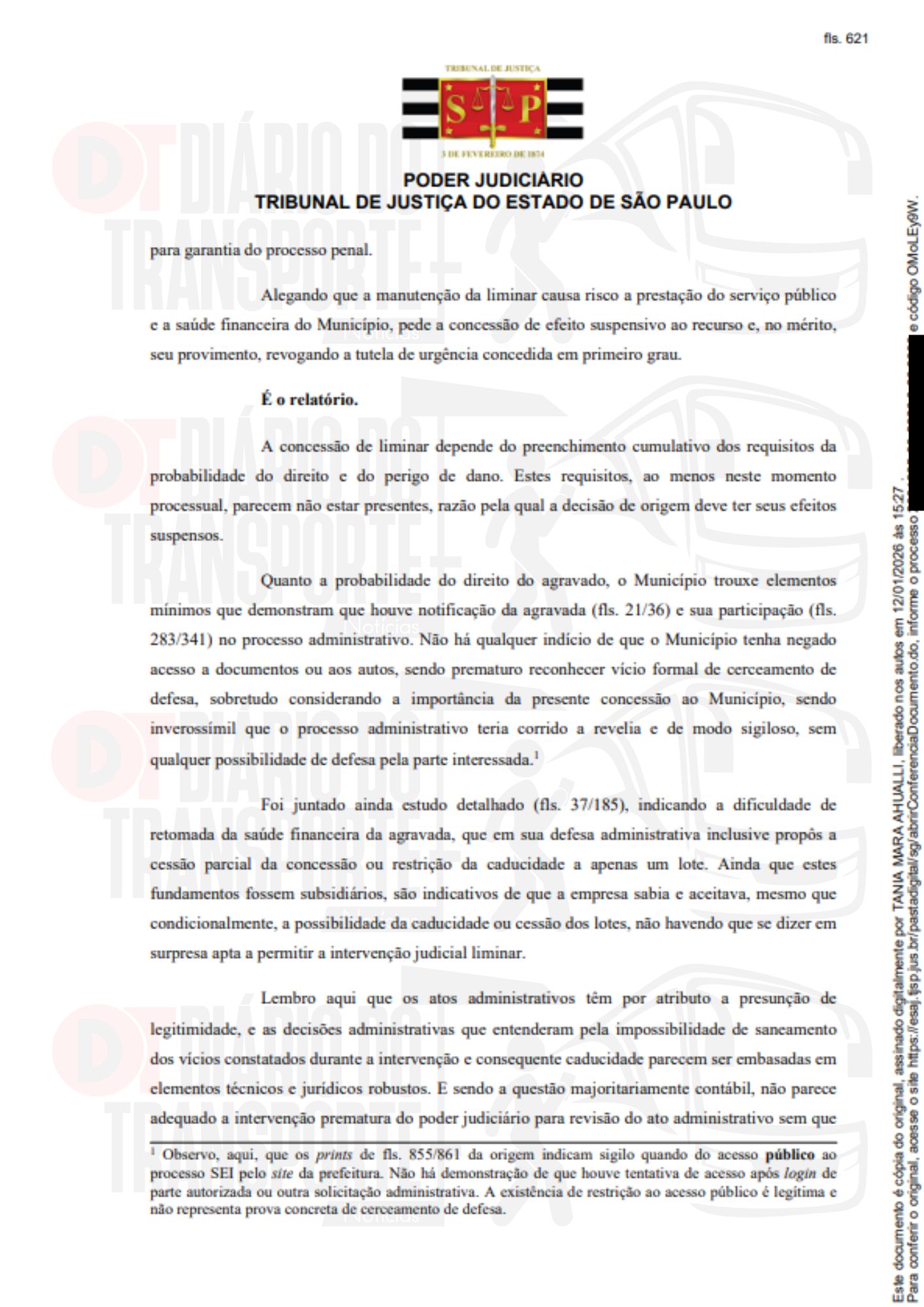 O Diário do Transporte informa em primeira-mão, na tarde desta segunda-feira, 12 de janeiro de 2026, que a 6ª Câmara de Direito Público do Tribunal de Justiça de São Paulo atendeu recurso (agravo de instrumento) da gestão do prefeito da capital paulista, Ricardo Nunes, e manteve válido o decreto que rompe os dois contratos com a empresa de ônibus da zona Sul da capital paulista, Transwolff, suspeita de ligação com a facção criminosa PCC (Primeiro Comando da Capital).