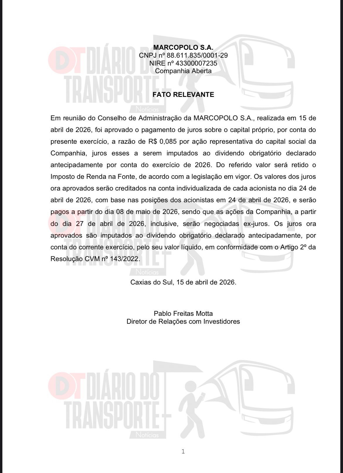 Isso porque, no Fato Relevante, a Marcopolo anuncia que as ações serão negociadas ex-juros a partir do dia 27 de abril de 2026.