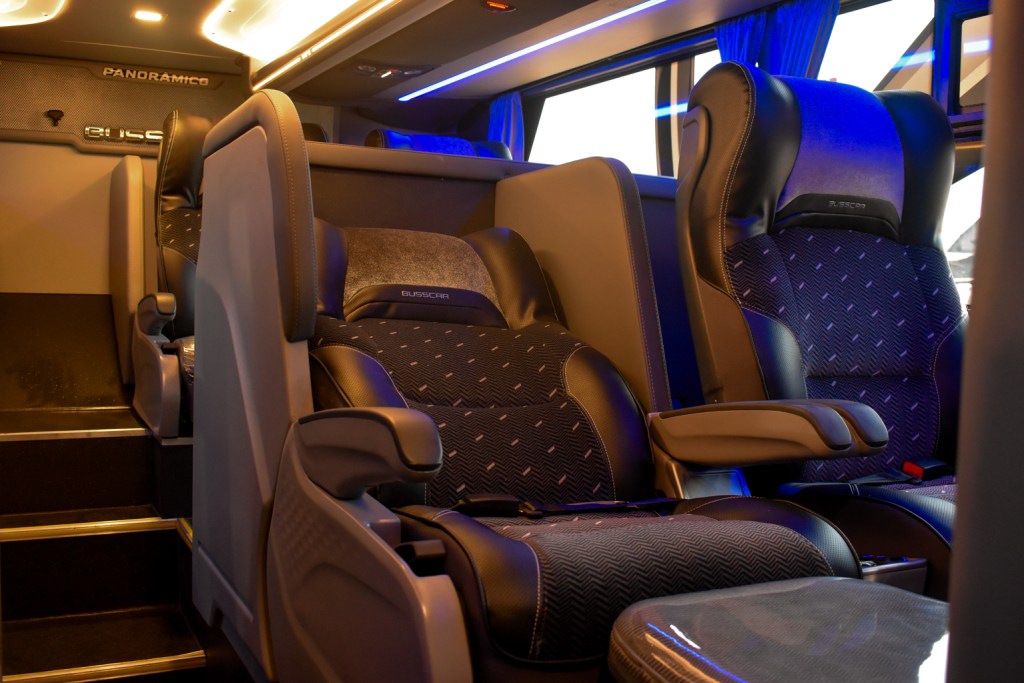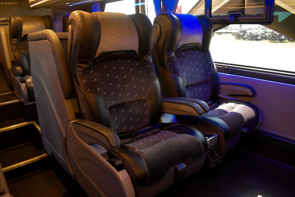 No piso superior, 46 poltronas Class Leito Turismo com revestimento em espuma viscoelástica garantem conforto mesmo em longas viagens. Os assentos contam com apoio de pés com balancim, apoio de pernas, braço escamoteável e porta-copos individual, além de iluminação azul em LED e ar-condicionado com filtro anti-pólen no interior do veículo.