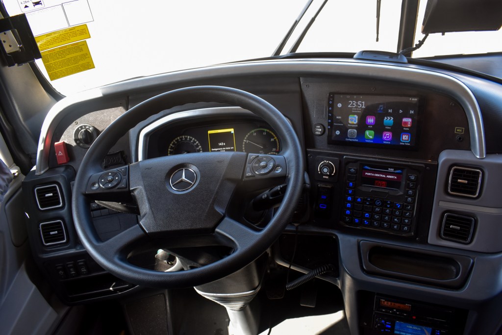 Voltado à experiência dos passageiros, o sistema de entretenimento do Panorâmico DD NB1 para a Mercedes-Benz SBC incluiu uma central multimídia touchscreen de 9 polegadas compatível com Android e iOS, rádio multifuncional e servidor de filmes conectado a um roteador Wi-Fi, que amplia as possibilidades de uso durante o percurso.
