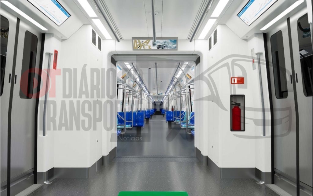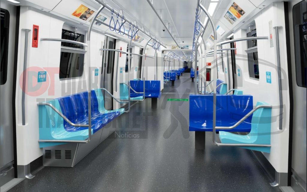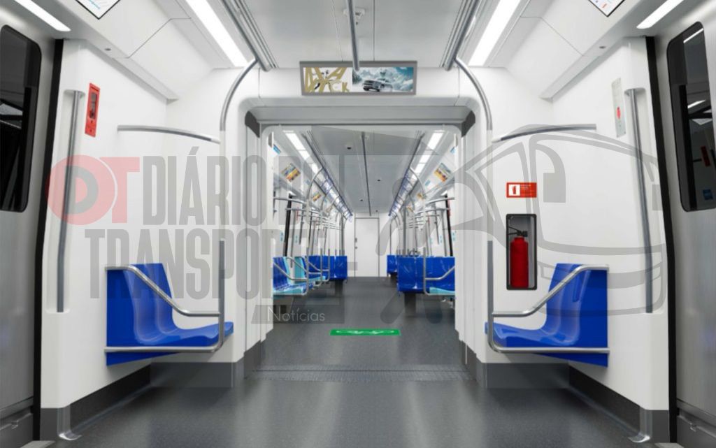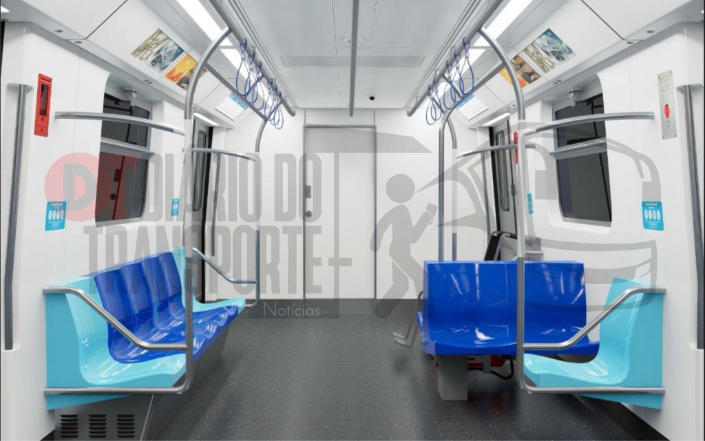 Já o interior do trem terá paredes laterais e teto na cor branca e piso com revestimento cinza escuro. Os assentos preferenciais são da cor azul clara e os demais serão azul em tom mais forte. Barras e alças estarão distribuídas ao longo do salão, que terá iluminação homogênea em LED, com painéis eletrônicos de informação completando um ambiente interno moderno, pensado para a boa experiência do passageiro.