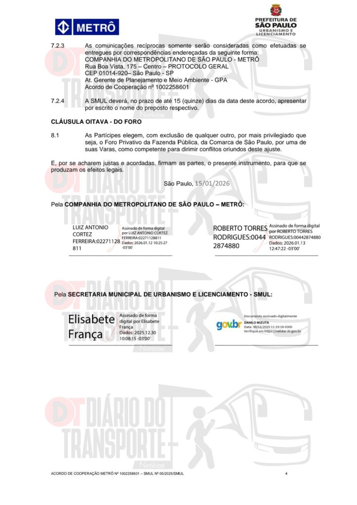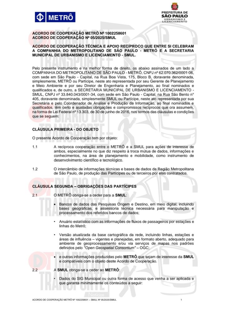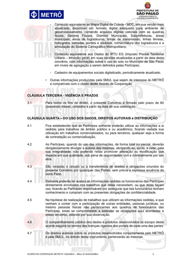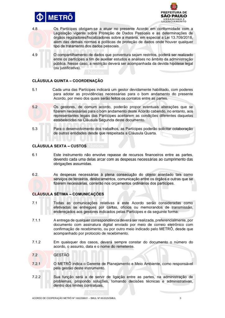 O contrato é de 60 meses e, de acordo com o documento oficial, Metrô e SMUL têm as seguintes obrigações de transferências de dados e obrigações: