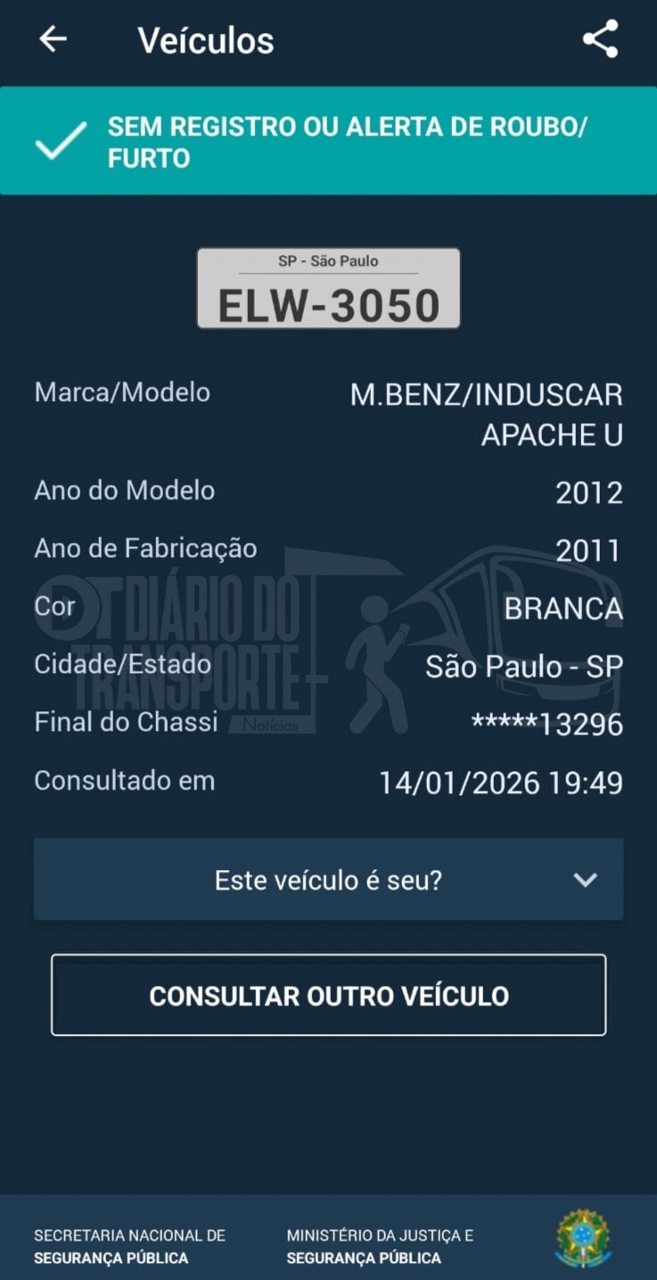 De acordo com o Sinesp Cidadão, o aplicativo do Sistema Nacional de Informações de Segurança Pública, do Governo Federal, o modelo deste ônibus é 2012, mas a fabricação foi em 2011 (15 anos).