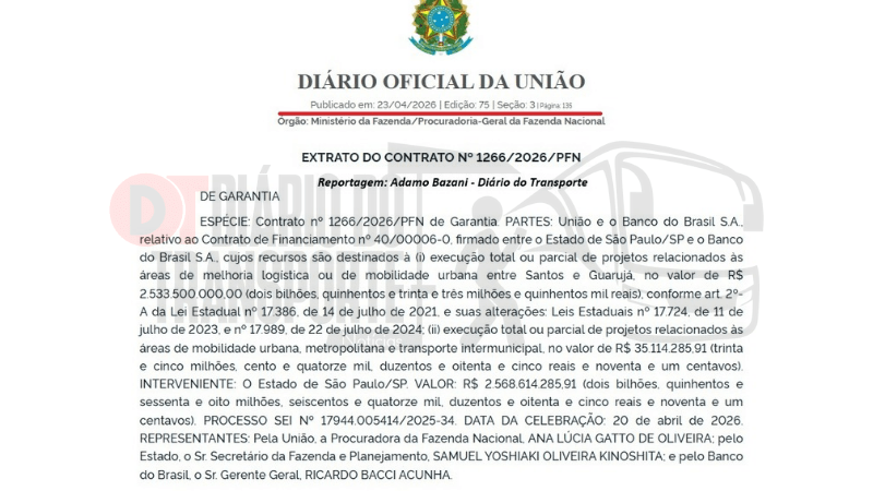 A Procuradoria-Geral da Fazenda Nacional, do Ministério da Fazenda, formalizou nesta quinta-feira, 23 de abril de 2026, a garantia ao contrato de R$ 2,56 bilhões entre a União e o Banco do Brasil para a liberação do financiamento ao Governo do Estado de São Paulo referente à construção do túnel imerso entre Santos e Guarujá, no litoral Sul. A publicação do Extrato da Garantia do Contrato está na edição do DOU (Diário Oficial da União) desta quinta-feira (23).