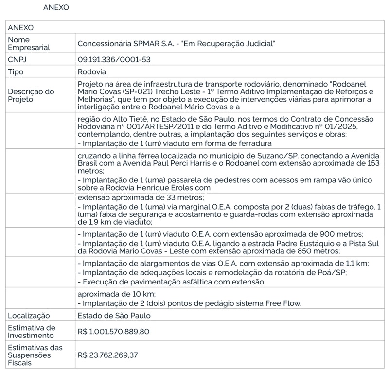 O governo federal enquadrou o projeto de reforços e melhorias do Rodoanel Leste, em São Paulo, no Regime Especial de Incentivos para o Desenvolvimento da Infraestrutura (REIDI) — mecanismo que autoriza a suspensão de tributos federais, como PIS/Pasep e Cofins, sobre bens e serviços utilizados diretamente em obras de infraestrutura. A medida busca viabilizar investimentos superiores a R$ 1 bilhão no Trecho Leste do anel viário paulista, sob responsabilidade da Concessionária SPMAR, concessionária formada por empresas do grupo CCR Rodovias e pela antiga Odebrecht Transport, hoje rebatizada como Novonor.