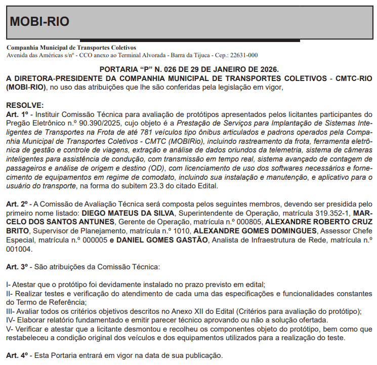 A Companhia Municipal de Transportes Coletivos (MOBI-Rio) instituiu uma comissão técnica responsável por avaliar os protótipos apresentados pelos licitantes do Pregão Eletrônico nº 90.390/2025, que trata da implantação de Sistemas Inteligentes de Transportes (ITS) na frota de até 781 ônibus articulados e padrons operados pela companhia no sistema BRT.