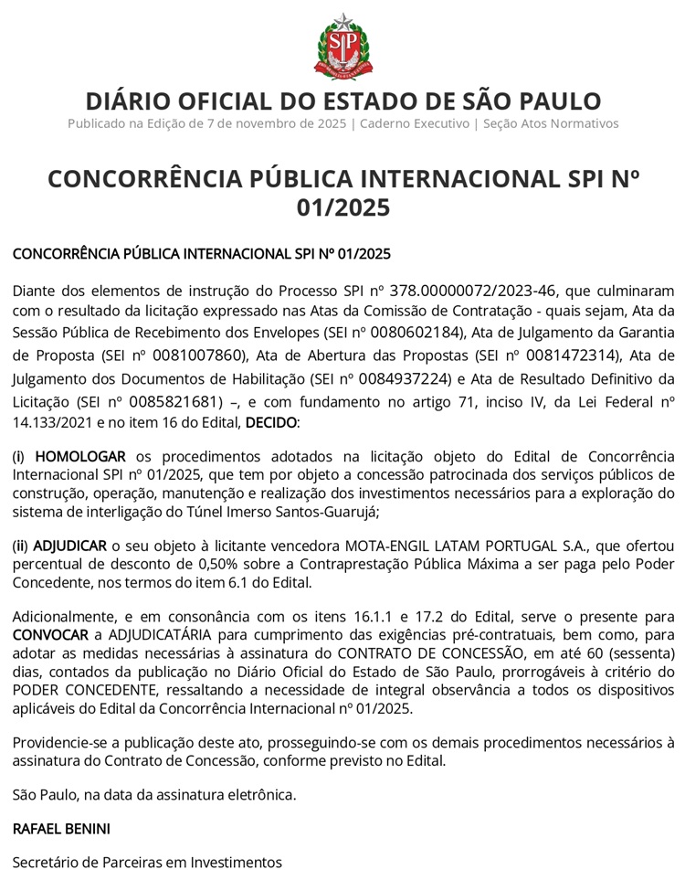 O Governo do Estado de São Paulo homologou oficialmente, nesta sexta-feira, 07 de novembro de 2025, o resultado da Concorrência Pública Internacional SPI nº 01/2025, que trata da concessão patrocinada para construção, operação e manutenção do Túnel Imerso Santos-Guarujá.