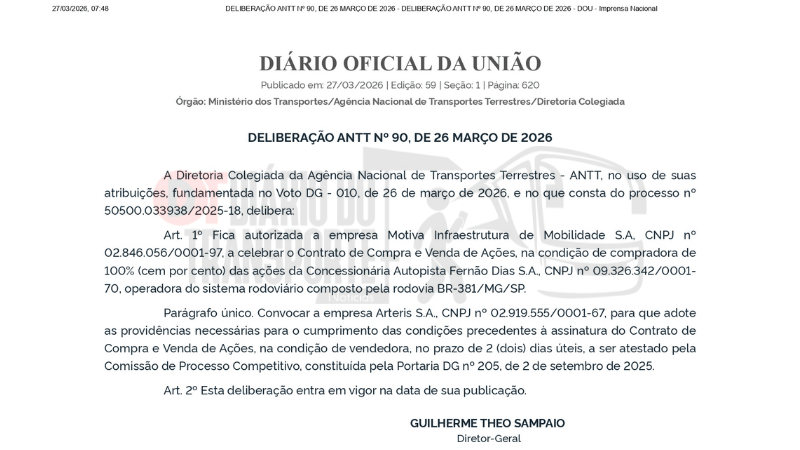 A Agência Nacional de Transportes Terrestres (ANTT) autorizou a Motiva Infraestrutura de Mobilidade S.A., antiga CCR, a assumir o controle da concessão da Rodovia Fernão Dias (BR-381/MG/SP), atualmente operada pela Arteris. A decisão consta na Deliberação ANTT nº 90, de 26 de março de 2026, publicada no Diário Oficial da União desta sexta-feira, 27 de março.