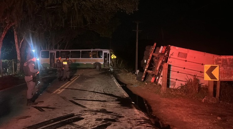 Ambos os sentidos da rodovia chegaram a ser interditados, com o coletivo atravessado e a carreta tombada.