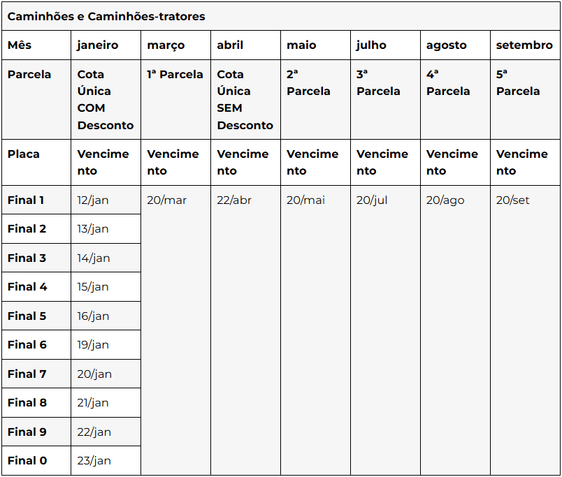Os caminhões têm prazos diferenciados: para o pagamento integral em janeiro é concedido desconto de 3%; aos que escolherem pagar em cota única, sem desconto, é 22 de abril. Para os proprietários que optarem pelo parcelamento em três, quatro ou cinco vezes, sem desconto, os vencimentos são em 20 de março, 20 de maio, 20 de julho, 20 de agosto e 20 de setembro.