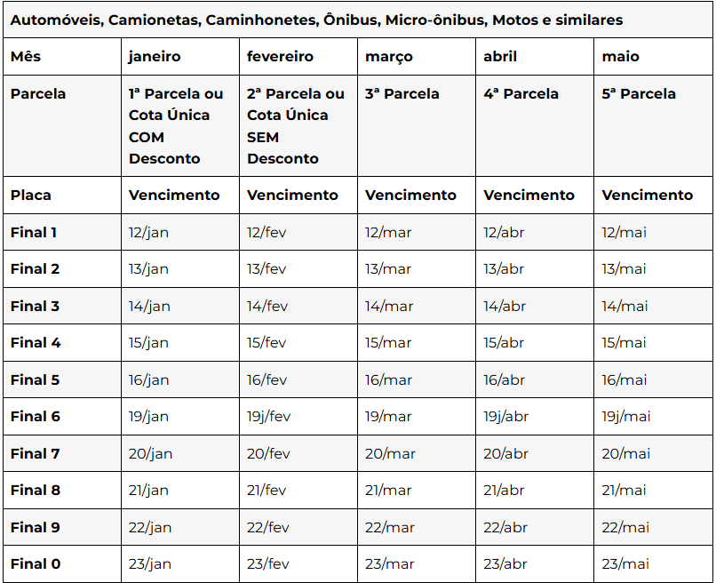 Os proprietários poderão escolher entre as seguintes formas de pagamento com vencimentos de acordo com o final de placa do veículo: