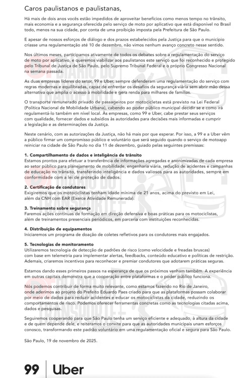 As gigantes internacionais de aplicativos, Uber e 99, anunciaram nesta terça-feira, 18 de novembro de 2025, que no dia 11 de dezembro vão retomar os serviços de mototáxis na cidade de São Paulo.