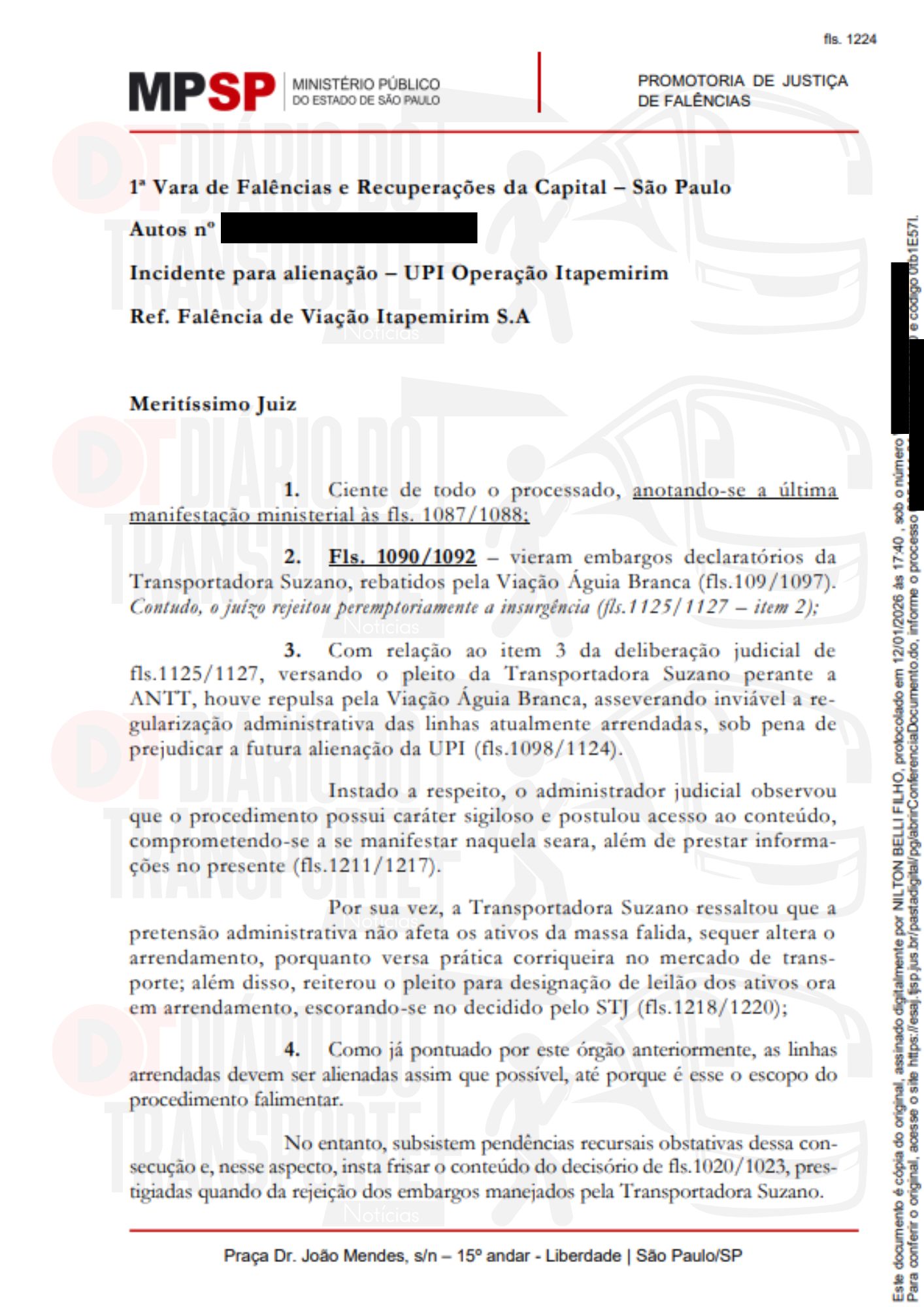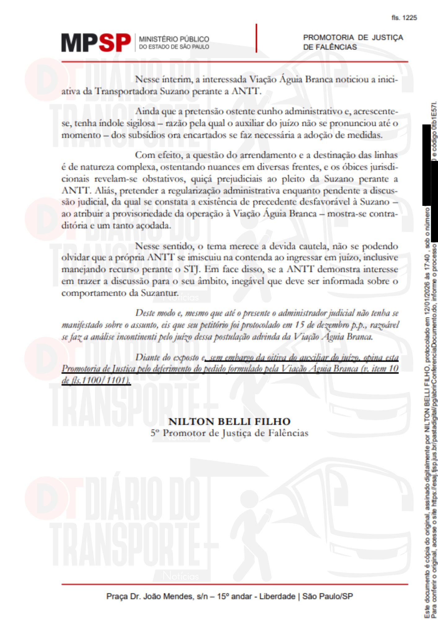 Na manifestação do MP, o 5º Promotor de Justiça de Falências, Nilton Belli Filho, diz que deve ser atendida a solicitação da Águia Branca, que pede que a ANTT negue o pedido da Suzantur e esclareça os impactos da natureza do pleito da empresa do ABC.