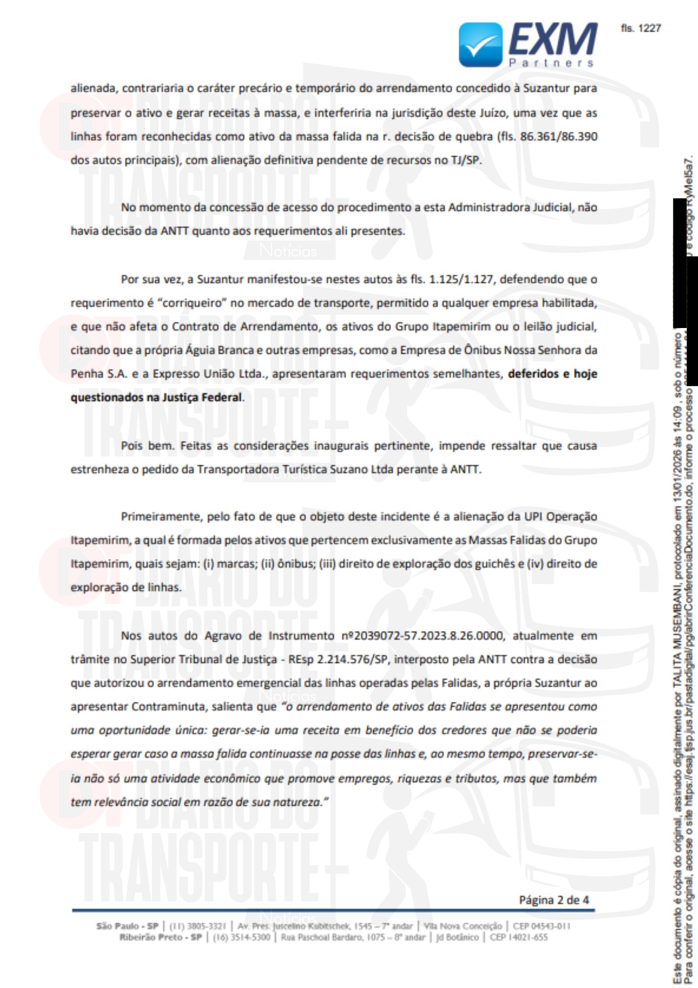A EXM Partners também se mostrou contra a tese, que beneficiaria a Suzantur, de que atrasar o leilão para fixação de preço mínimo das linhas, ônibus, marcas e guichês traria efeitos positivos à massa falida.