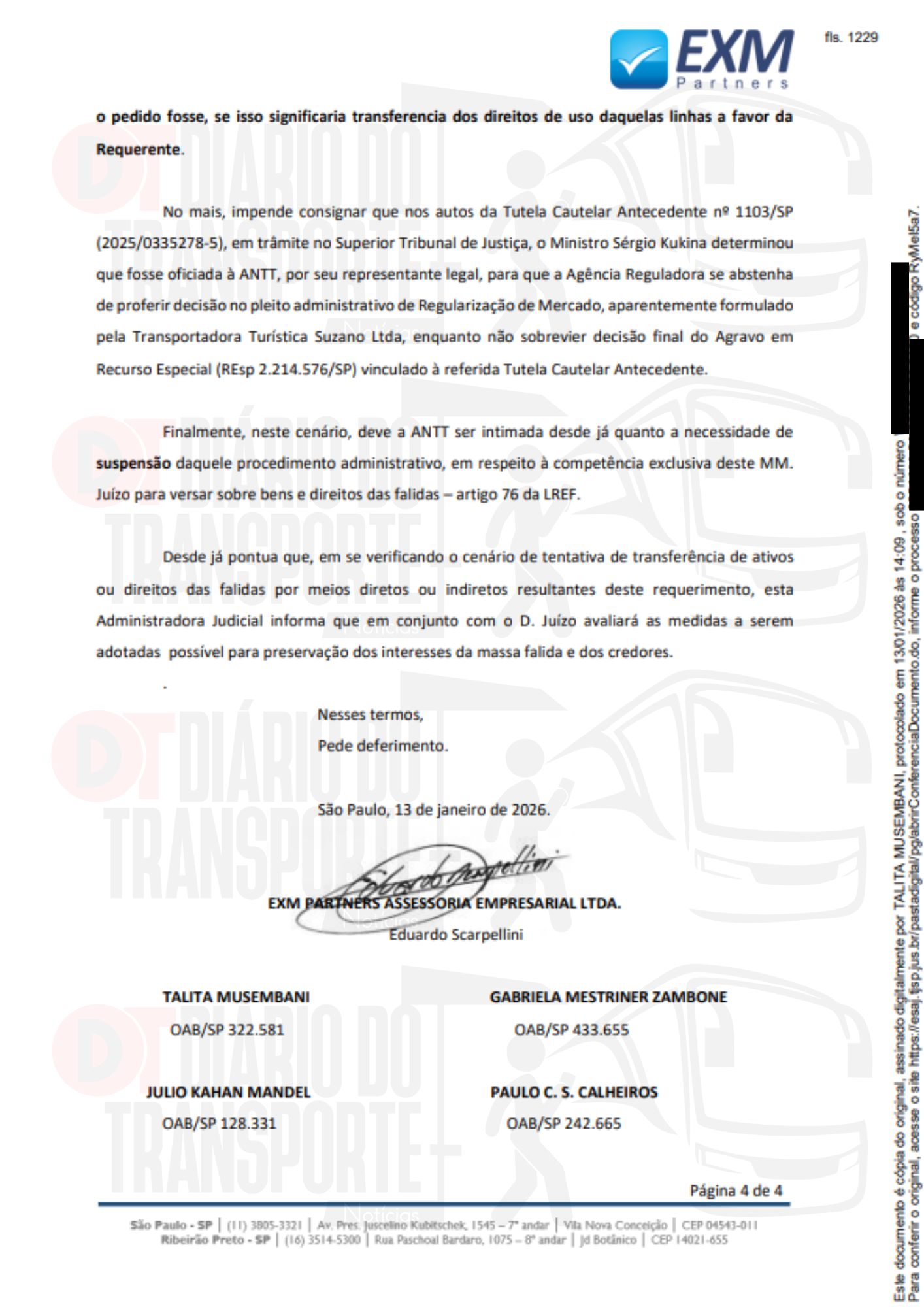 As manifestações foram protocoladas no andamento processual, respectivamente, na segunda-feira, 12 de janeiro de 2026, no caso do MPSP, e, nesta terça-feira (13), pela EXM. O Diário do Transporte traz em primeira-mão e de maneira exclusiva nesta terça-feira, 13 de janeiro de 2026.
