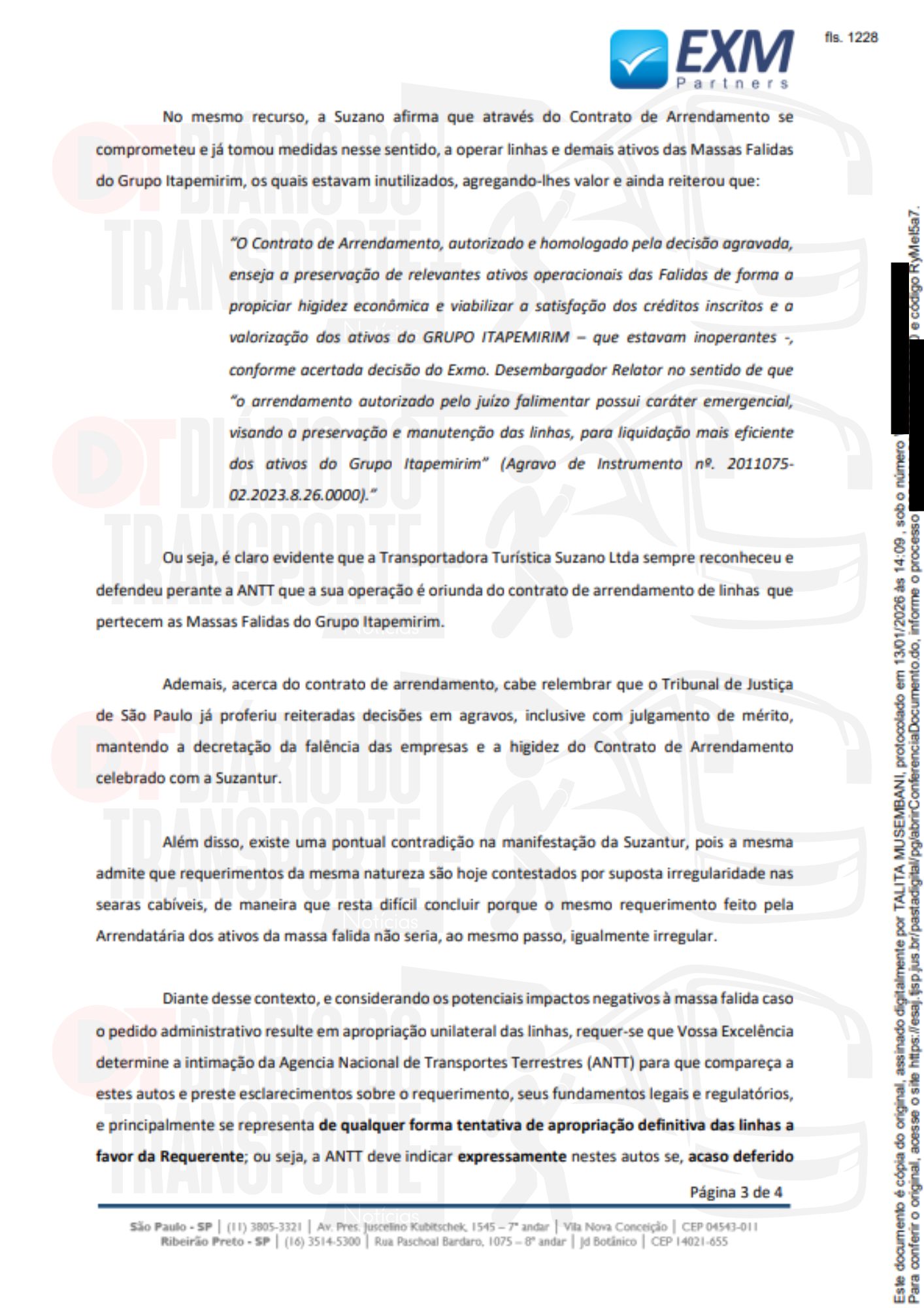 O MPSP (Ministério Público de São Paulo) e a administradora judicial da falência do Grupo Itapemirim, EXM Partners, se manifestaram no processo sobre o arrendamento das 125 linhas e 746 mercados de ônibus rodoviários, contra pedido da atual arrendatária, Suzantur, do ABC Paulista, junto a ANTT (Agência Nacional de Transportes Terrestres) que poderia resultar no direito definitivo da operação dos serviços.