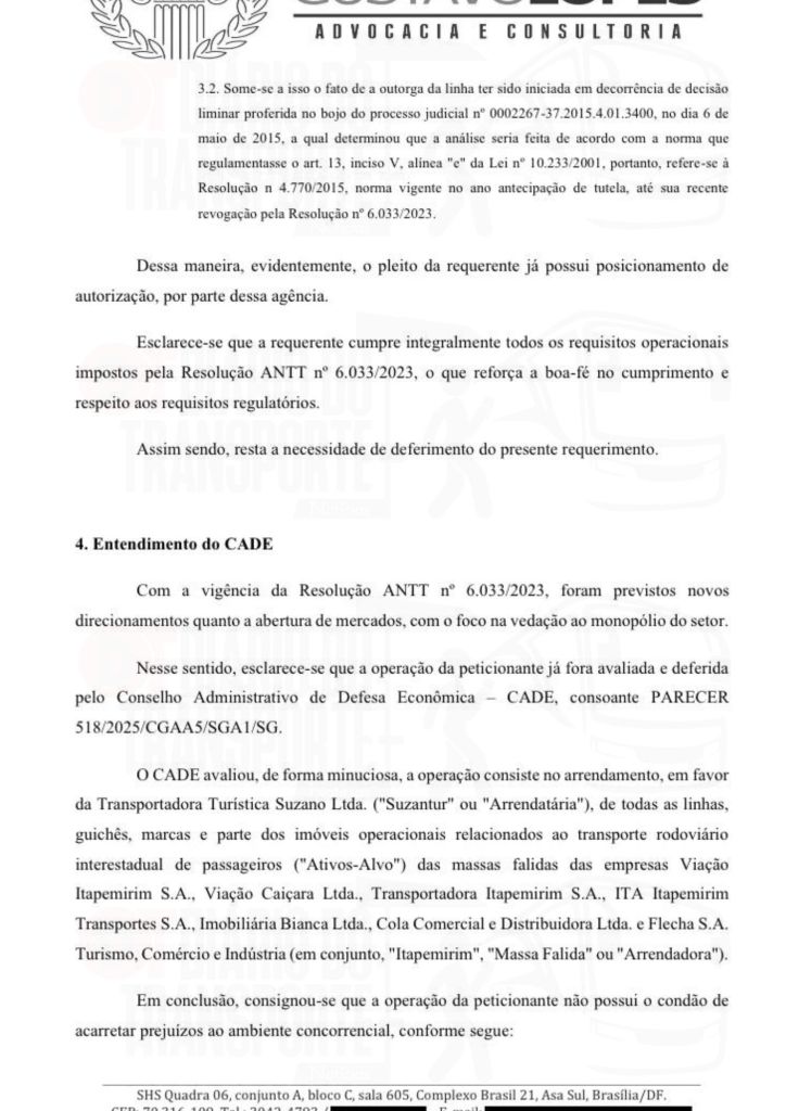 O requerimento administrativo apresentado pela Suzantur perante a ANTT — cujo objetivo é transformar uma operação provisória, decorrente de decisão judicial falimentar, em titularidade definitiva das linhas — parece impactar de forma imediata e direta nesta falência. Isso porque, se deferido, o pedido administrativo: