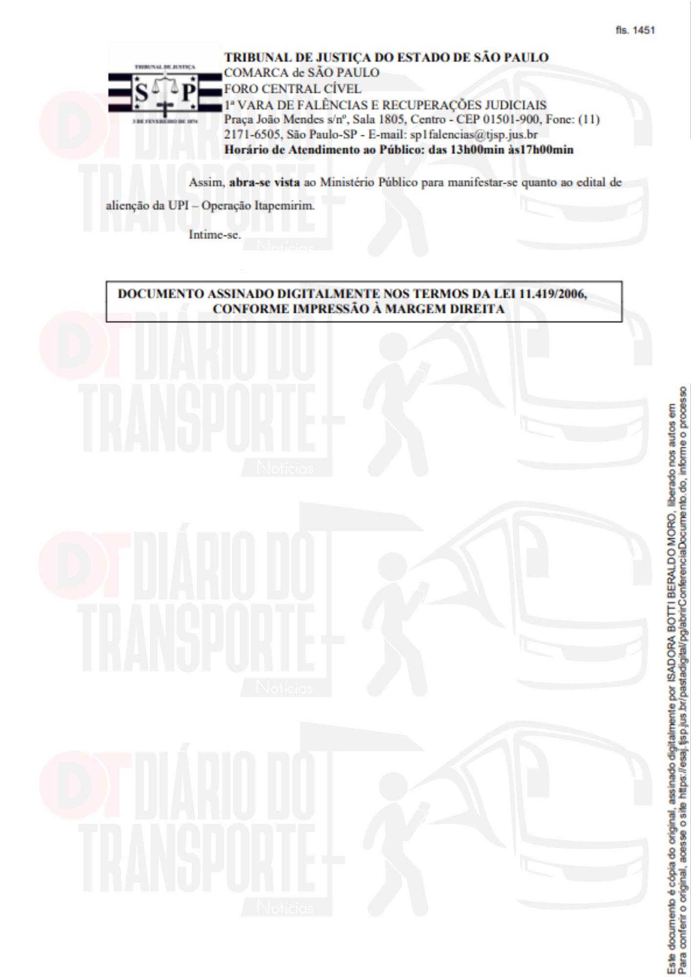 A juíza Isadora Botti Beraldo Moro, da 1ª Vara de Falências e Recuperações Judiciais, do Tribunal de Justiça de São Paulo, intimou o MP (Ministério Público) a se manifestar sobre a proposta de novo edital do leilão da falência do Grupo Itapemirim apresentada pela administradora Judicial da Falência, EXM Partners.