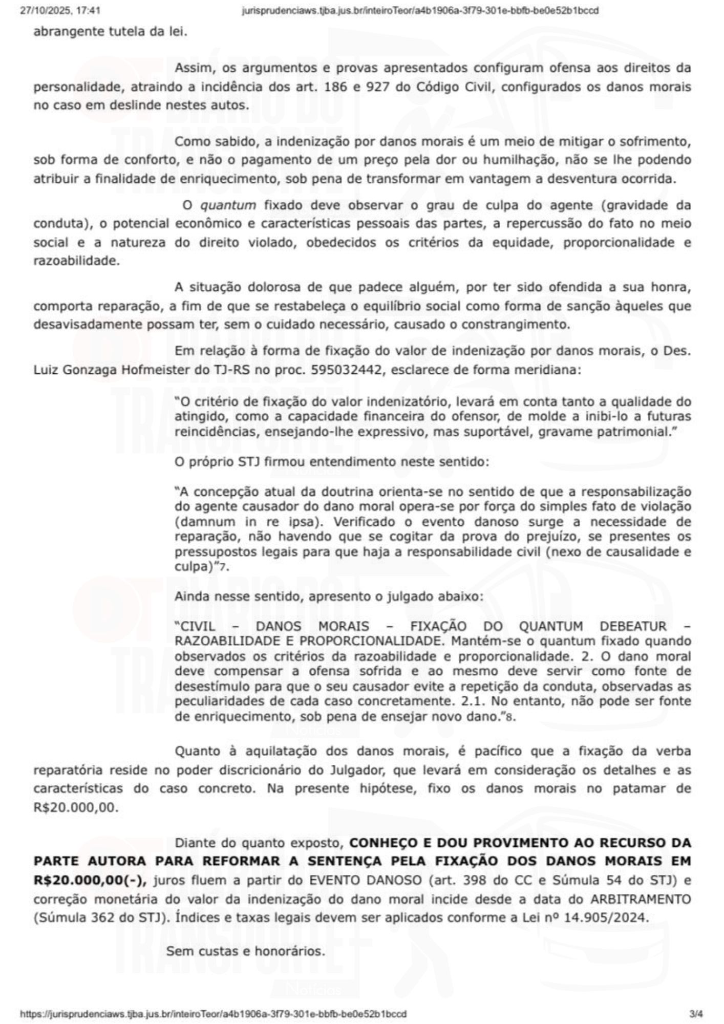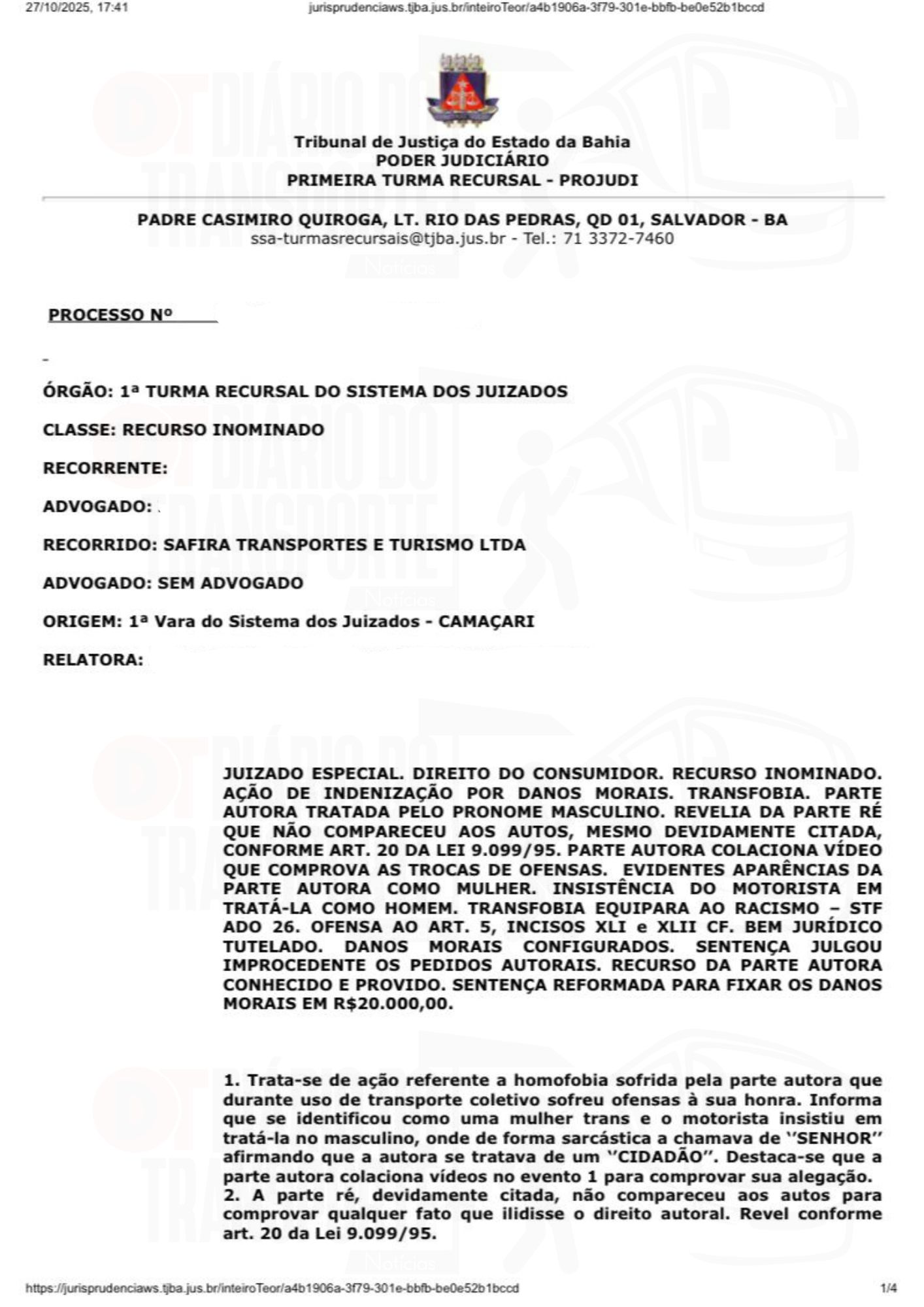 O valor, conforme acórdão da 1ª Turma Recursal do Sistema dos Juizados do TJBA (Tribunal de Justiça da Bahia), de 27 de outubro de 2025, deve ser pago pela companhia Safira Transportes Turismo Ltda.