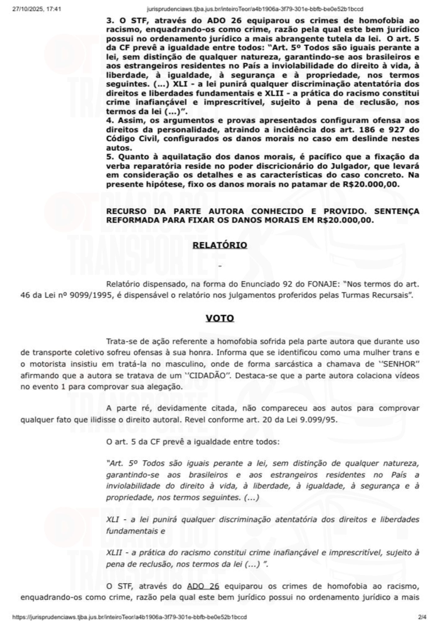 “Trata-se de ação referente a homofobia sofrida pela parte autora que durante uso de transporte coletivo sofreu ofensas à sua honra. Informa que se identificou como uma mulher trans e o motorista insistiu em tratá-la no masculino, onde de forma sarcástica a chamava de ‘’SENHOR’’ afirmando que a autora se tratava de um ‘’CIDADÃO’. Destaca-se que a parte autora colaciona vídeos no evento 1 para comprovar sua alegação”. – diz trecho do despacho.
