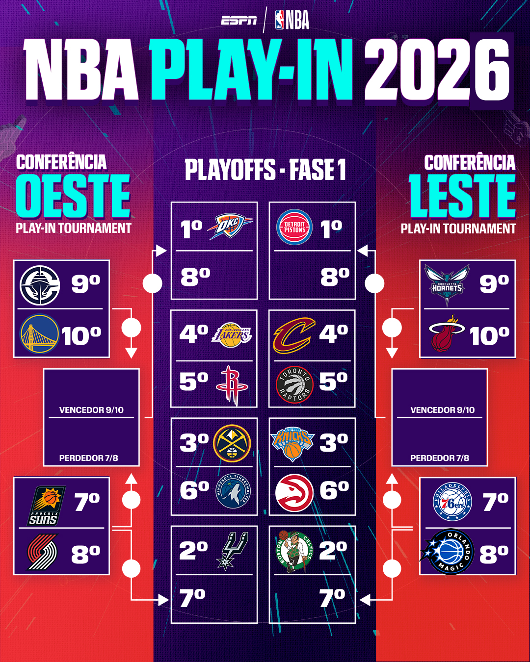Serão seis jogos, três pelo Leste e outros três no Oeste, envolvendo oito equipes: aquelas que terminaram entre 7º e 10º, disputa o play-in. Quem terminou nas seis primeiras colocações de cada conferência está garantido nos playoffs.
