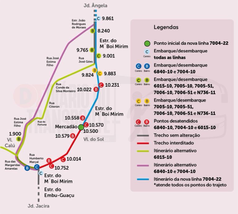 Sentido único: Estr. do M’Boi Mirim, Rua Luís Baldinato, acesso (Largo do Jd. Ângela) e Estr. do M’Boi Mirim.
