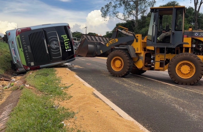 Na tarde desta quarta-feira, 18 de fevereiro de 2026, por volta das 15h30, um ônibus da Viação Garcia tombou após colidir contra a traseira de uma carreta que transportava soja na BR-277, na altura da Linha Cacic, em São Miguel do Iguaçu (PR).