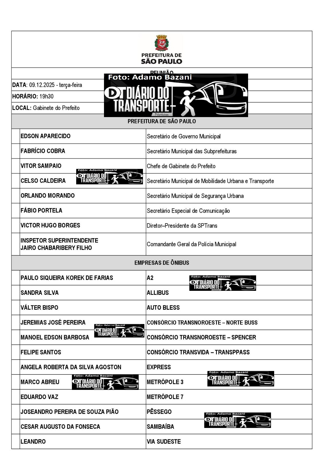 Mais cedo, representantes dos três grupos operacionais — Estrutural, Local/Regional (AR) e Distribuidor — se reuniram com o secretário municipal de Transportes, Celso Jorge Caldeira, e com o presidente da SPTrans, Victor Hugo Borges.