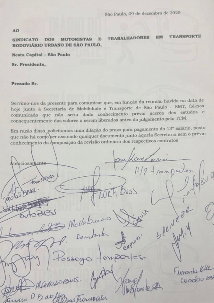 As empresas de ônibus de São Paulo enviaram nesta terça-feira (09) uma carta ao Sindicato dos Motoristas e Trabalhadores em Transporte Rodoviário Urbano de São Paulo pedindo mais prazo para pagar o 13º salário, previsto para 12 de dezembro. O motivo, segundo os operadores, é o atraso no processo de revisão quadrienal dos contratos, que está no Tribunal de Contas do Município (TCM) e deve ser julgado nesta quarta-feira (10).