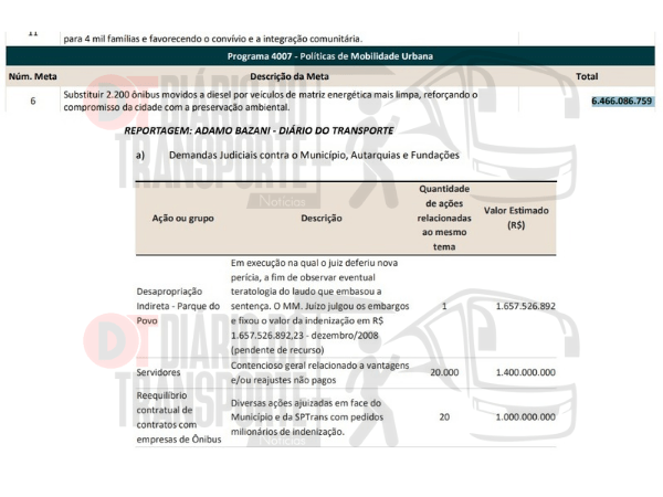 São considerados como riscos ficais, ou seja, dinheiro que a prefeitura vai tentar evitar que saia dos cofres públicos, mas podem acabar saindo, 20 processos de empresas de ônibus contra a administração.