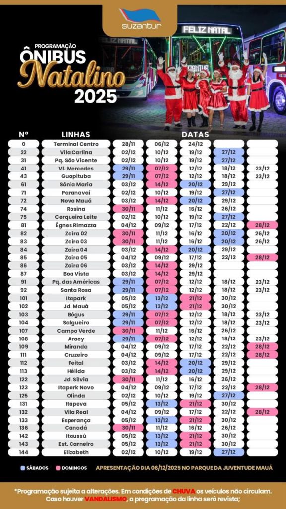 Ônibus com decoração especial passaram a operar em Mauá (SP) nesta sexta-feira, 28 de novembro, como parte da programação natalina organizada no município. As viagens utilizam veículos iluminados e caracterizados com elementos alusivos ao período festivo.