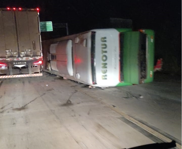 Um ônibus da Renotur, empresa sediada em Betim (MG), tombou na noite desta sexta-feira, 27 de dezembro de 2024, na BR-381, em Bom Jesus do Amparo (MG), deixando passageiros feridos.