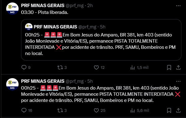 A pista foi liberada às 03h30 segundo registros da Polícia Rodoviária de Minas Gerais (PRF-MG):
