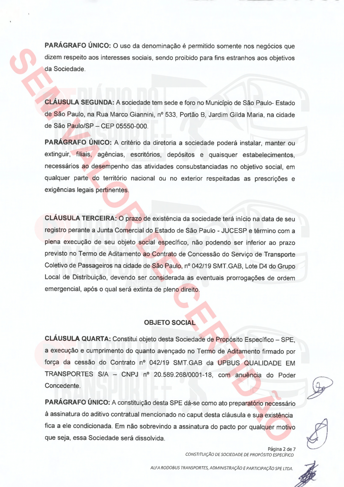 “Constitui objeto desta Sociedade de Propósito Específico – SPE. a execução e cumprimento do quanto avençado no Termo de Aditamento firmado por força da cessão do Contrato n° 042/19 SMT.GAB da UPBUS QUALIDADE EM TRANSPORTES S/A – CNPJ n° 20.589.268/0001-18. com anuência do Poder Concedente.”