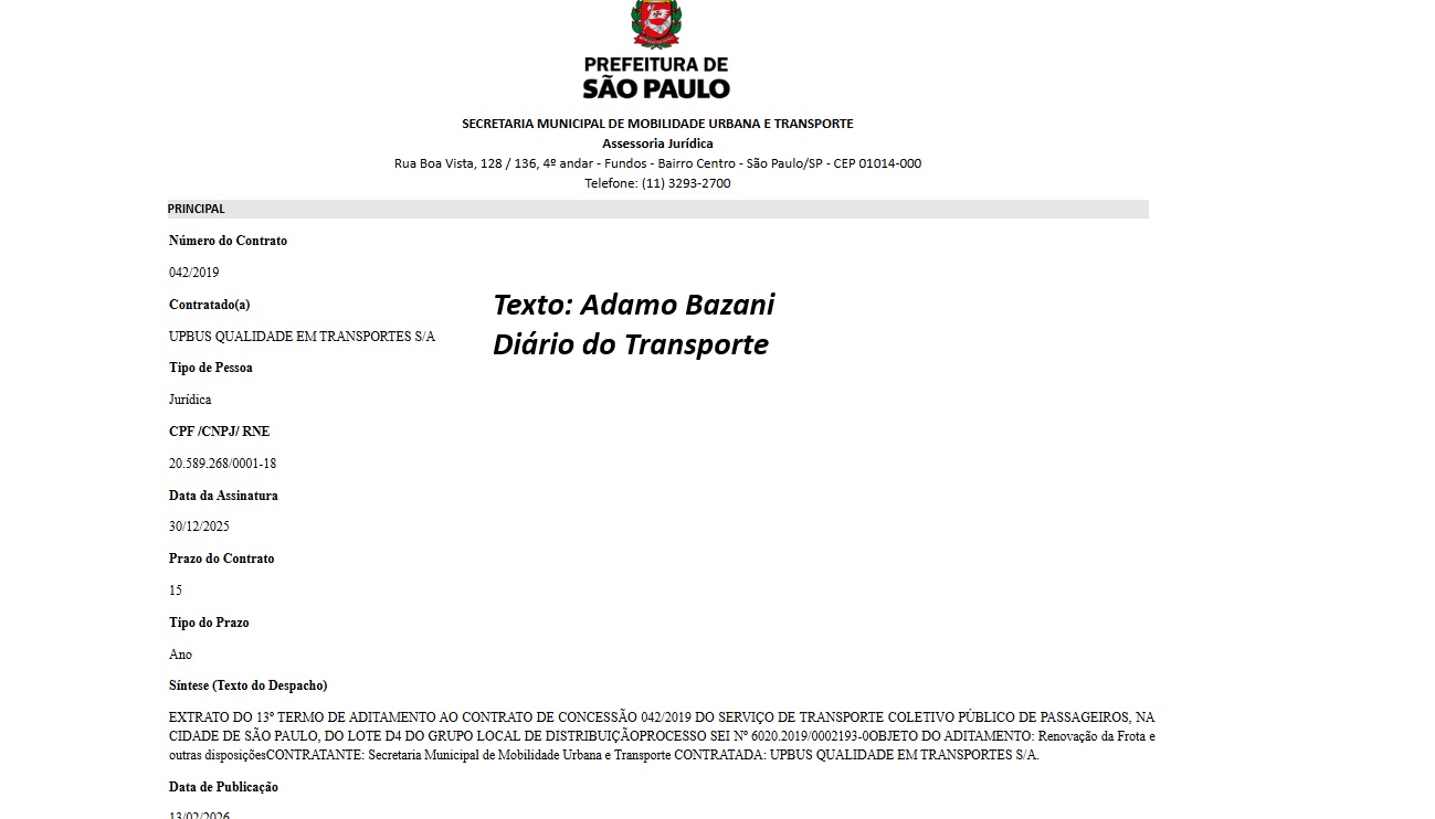 Como mostrou o Diário do Transporte, em primeira-mão, publicado no Diário Oficial da Cidade de São Paulo nesta sexta-feira, 13 de fevereiro de 2026, o aditivo de contrato que formaliza a transferência da empresa de ônibus UPBus, na zona Leste, para a Alfa Rodobus.