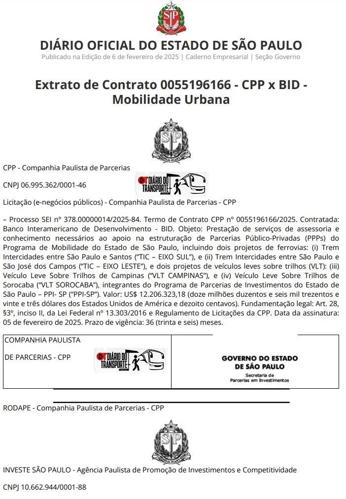 O contrato, assinado em 5 de fevereiro de 2025, tem como objetivo a prestação de serviços de assessoria e conhecimento na estruturação de Parcerias Público-Privadas (PPPs) para o Programa de Mobilidade do Estado de São Paulo.