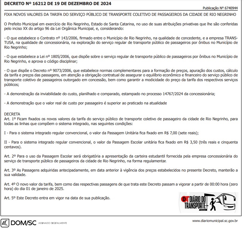 Desde o dia 1º de janeiro de 2025, o preço da passagem de ônibus em Rio Negrinho (SC), cidade com 36 mil habiatntes, passou de R$ 6,00 para R$ 7,00.