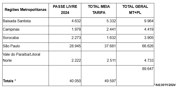 Em 2024, até 30/11, foram emitidos pela EMTU 89.647 passes escolares nas cinco regiões metropolitanas do Estado (São Paulo, Baixada Santista, Campinas, Vale do Paraíba/Litoral Norte e Sorocaba), sendo 40.050 Passes Livres e 49.597 Meia Tarifas.