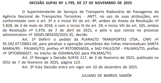A Agência Nacional de Transportes Terrestres (ANTT) autorizou a Planalto Transportes a paralisar, de forma simultânea, a operação de dois serviços interestaduais no trecho entre Goiânia (GO) e Palmas (TO). A medida consta na Decisão SUPAS nº 1.799, de 27 de novembro de 2025, publicada no Diário Oficial da União.
