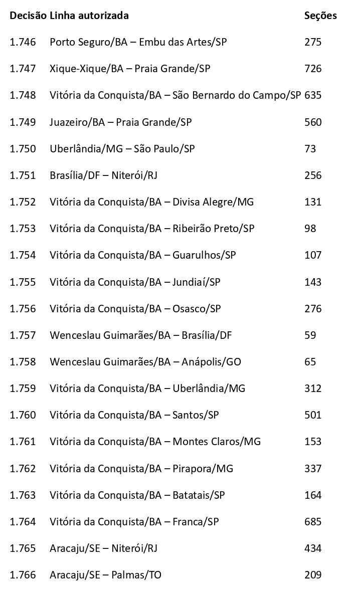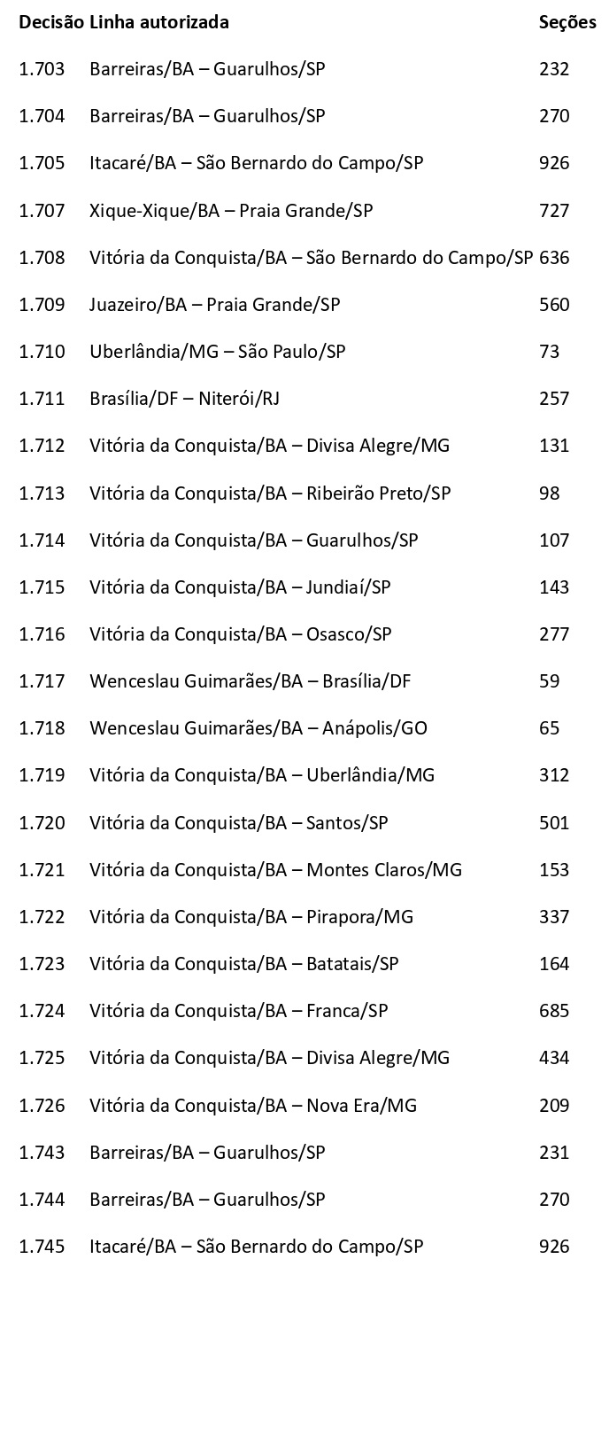 A Agência Nacional de Transportes Terrestres (ANTT) publicou no Diário Oficial da União desta terça-feira, 02 de dezembro de 2025, um conjunto de 47 decisões deferindo pedidos da Jotamar Comércio de Peças e Transportes Rodoviário para operar linhas interestaduais.