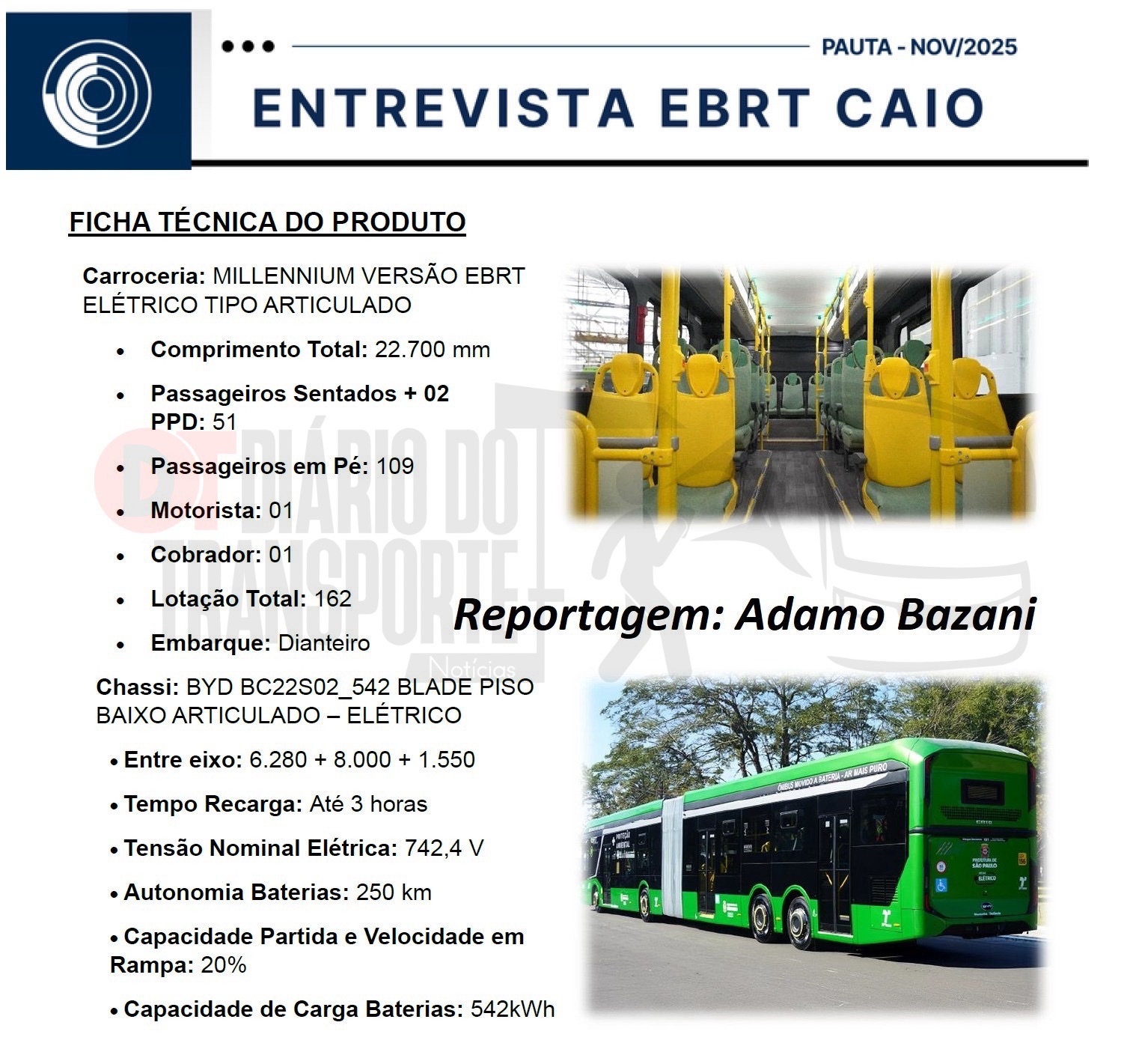Com chassis e equipamentos da BYD e uma nova tecnologia de baterias denominada Blade (mais leves, mais finas e com maior autonomia e carregando até pela metade do tempo), o ônibus, na configuração da SPTrans (São Paulo Transporte – gerenciadora da prefeitura da capital paulista) tem 22,7 metros de comprimento, capacidade para 162 passageiros e itens como: