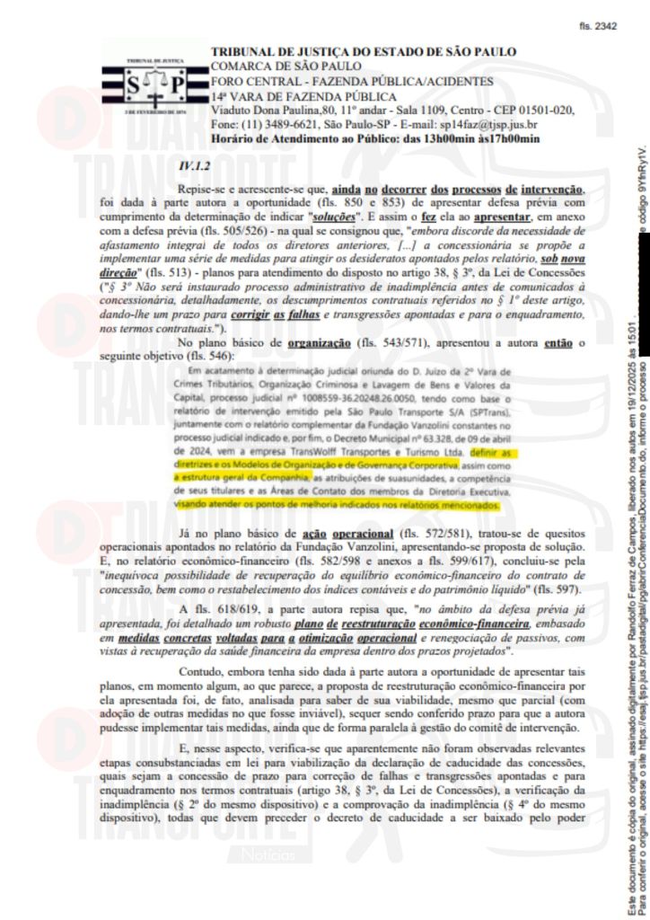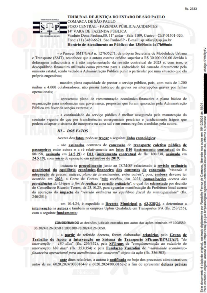 Como mostrou o Diário do Transporte, o juiz Randolfo Ferraz de Campos, da 14ª Vara da Fazenda Pública da capital paulista atendeu na tarde desta sexta-feira, 19 de dezembro de 2025, a defesa da empresa de ônibus Transwolff e suspendeu o decreto do prefeito Ricardo Nunes que quebrou os contratos com a viação, que estava sob intervenção desde operação do Ministério Público de São Paulo, em 09 de abril de 2024.